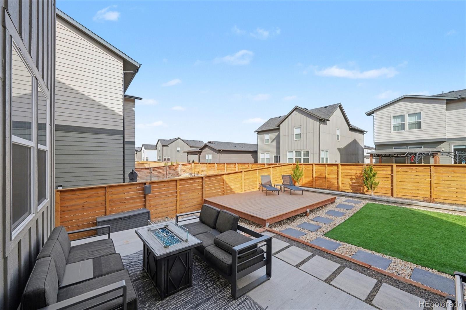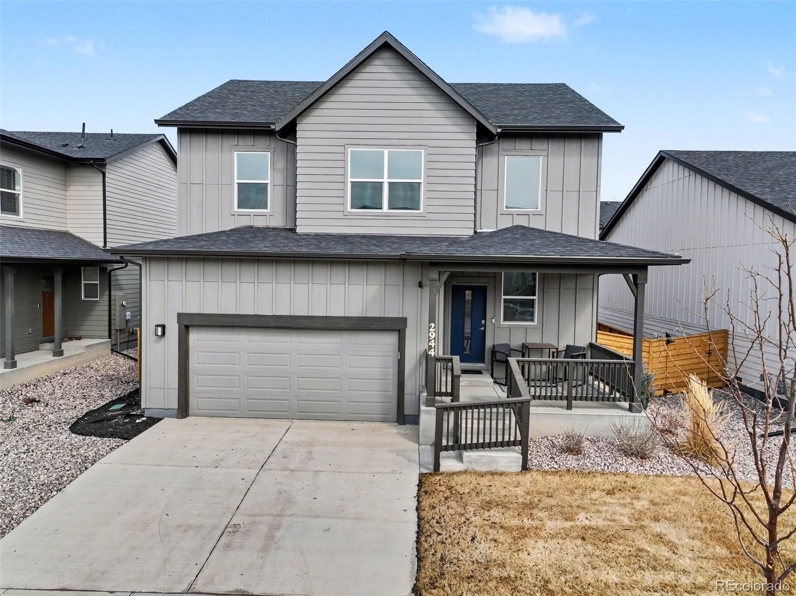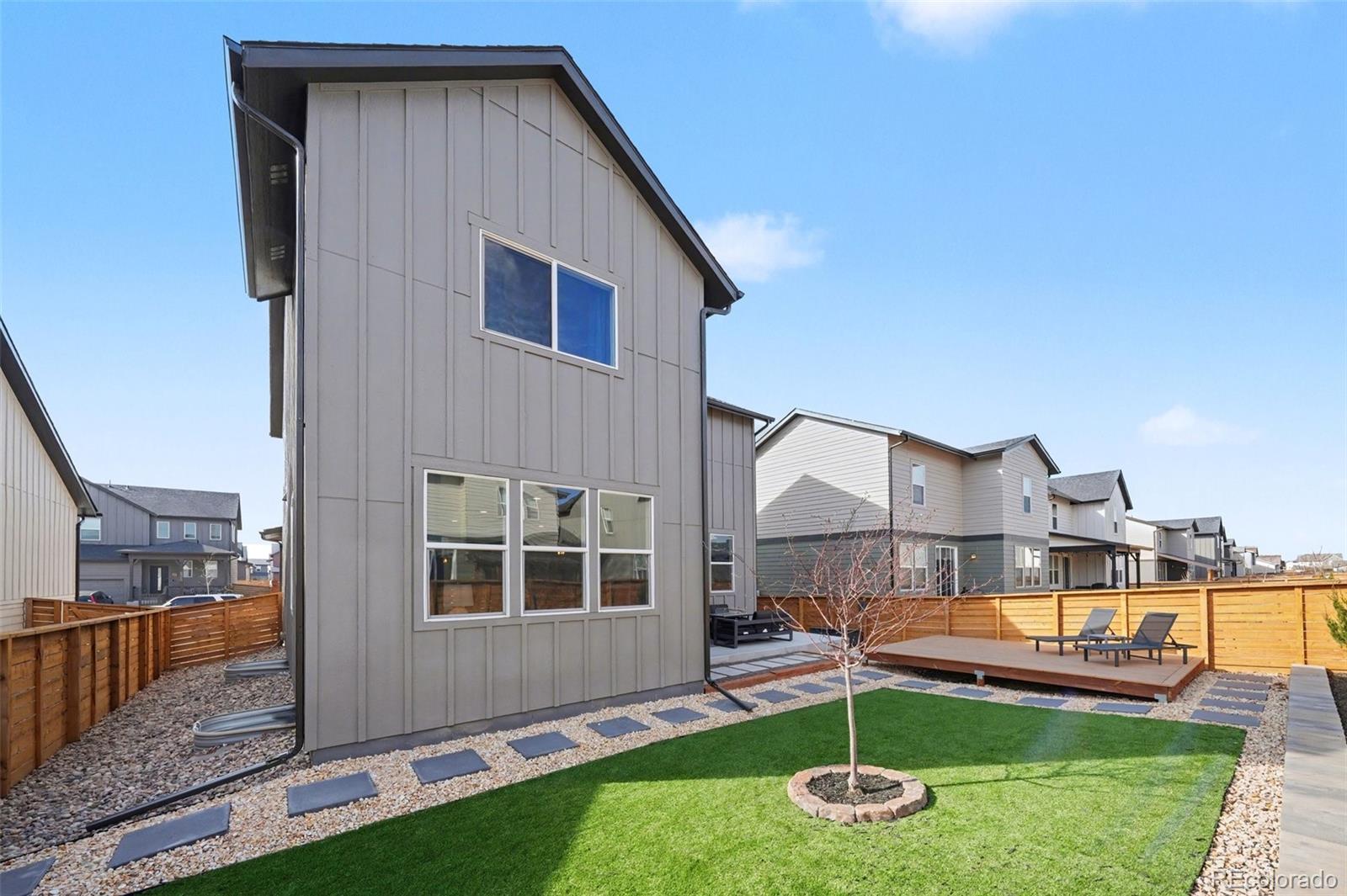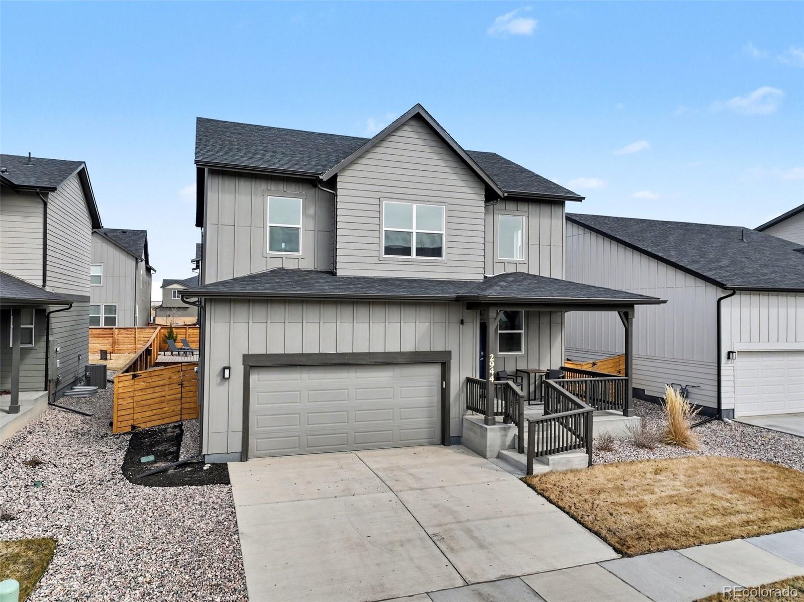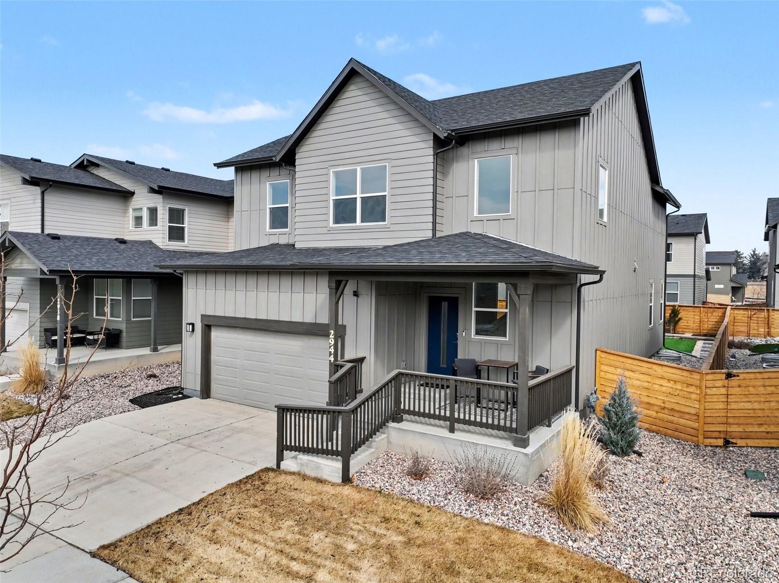 Open-concept 3-bedroom, 3-bath two-story home in the Mosaic neighborhood of Fort Collins with a professionally landscaped backyard and upgraded garage. The kitchen features quartz countertops, white soft-close cabinetry, stainless steel appliances, and an accent backsplash. The main level includes a flexible space suitable for an office or workspace. Upstairs offers a loft, laundry room with side-by-side washer and dryer, and three bedrooms. Additional updates include modern light fixtures, ceiling fans, and updated cabinet hardware. The unfinished basement includes rough-in plumbing for future expansion. The insulated two-car garage is drywalled and professionally finished with heating, air conditioning, EV-ready wiring, and a high-lift garage door. The backyard is professionally landscaped with low-maintenance turf, drip irrigation, and a sprinkler system, along with a concrete patio, freestanding deck, and apple tree. Custom fencing surrounds the front porch. Located in the Mosaic neighborhood with access to community amenities including a pool, pickleball courts, parks, and trails, and convenient access to I-25, the Fort Collins-Loveland Airport area, and Old Town Fort Collins.