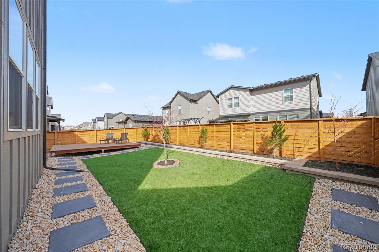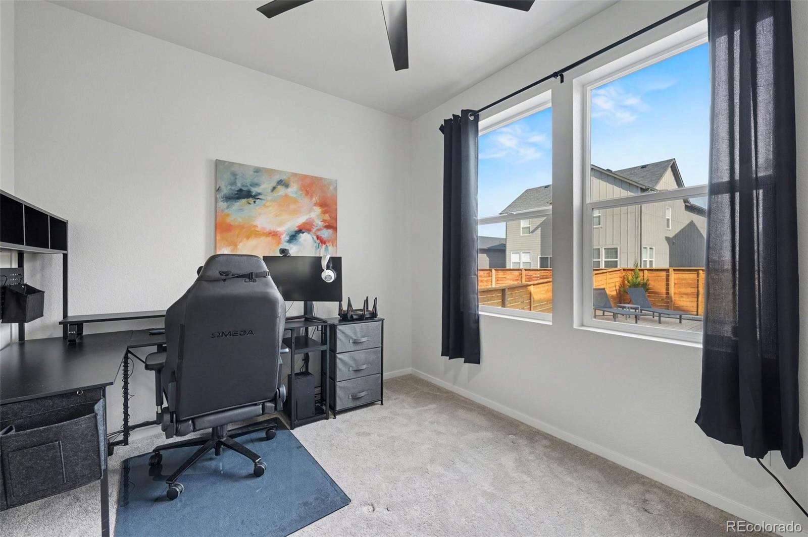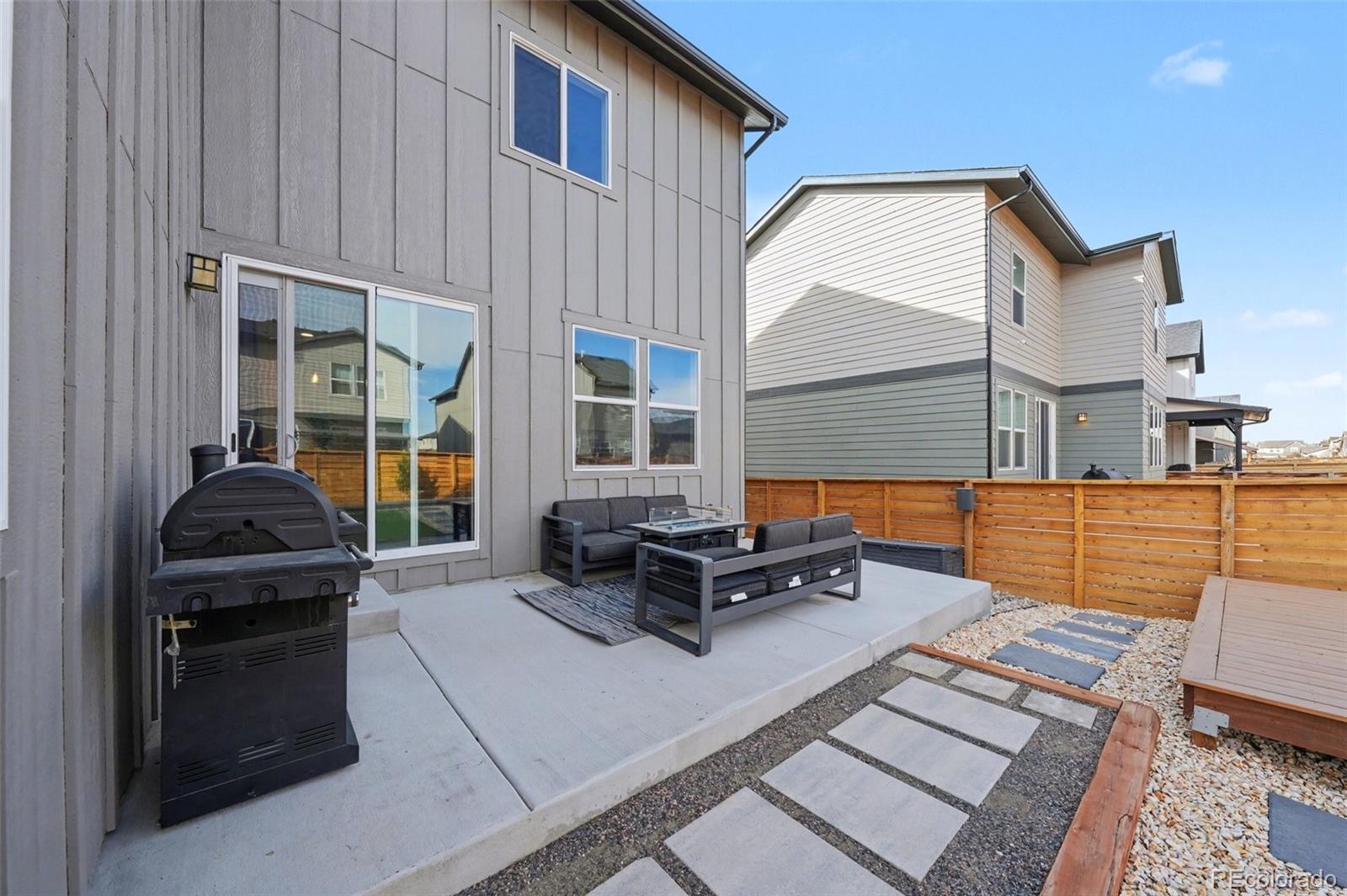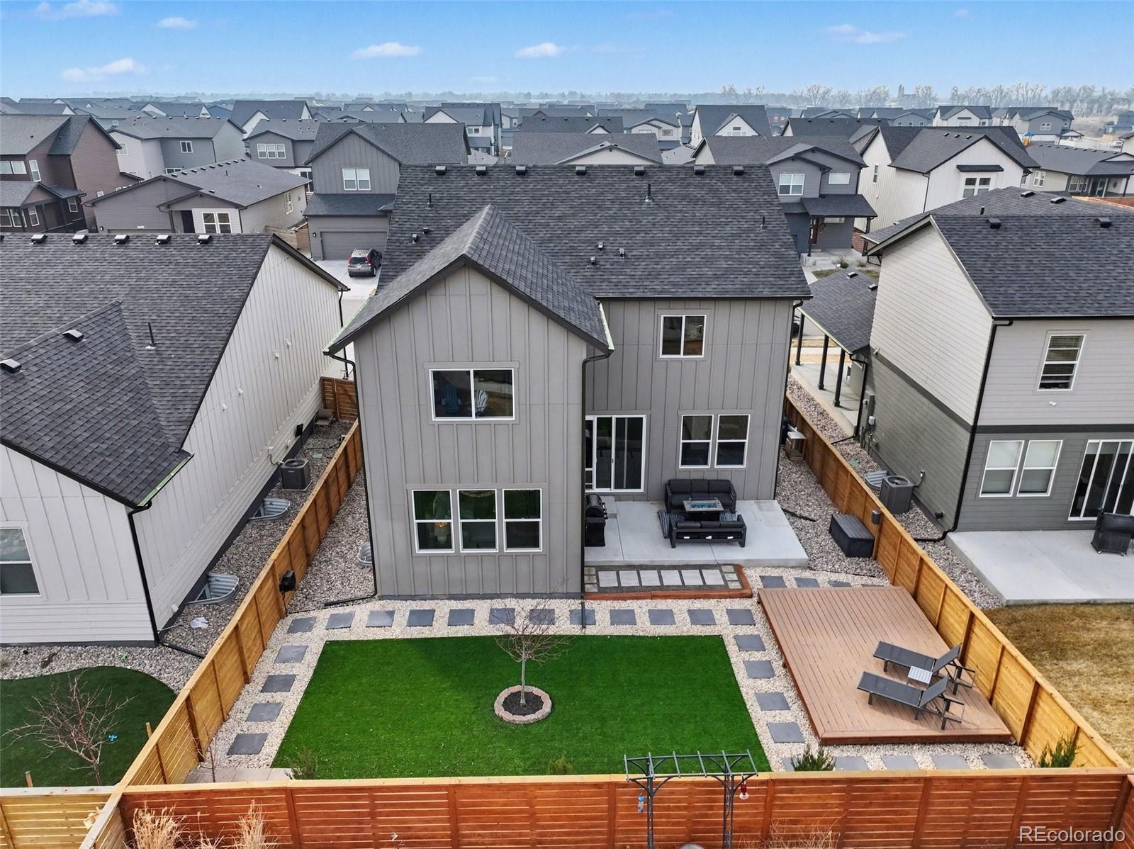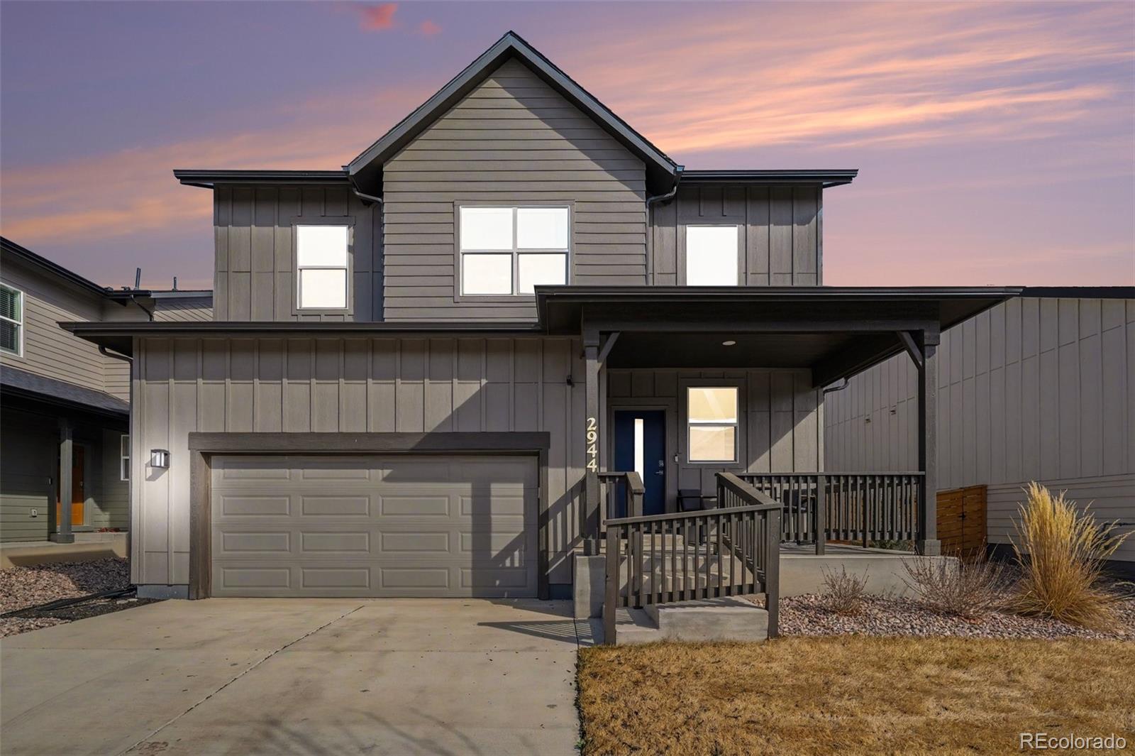 Open-concept 3-bedroom, 3-bath two-story home in the Mosaic neighborhood of Fort Collins with a professionally landscaped backyard and upgraded garage. The kitchen features quartz countertops, white soft-close cabinetry, stainless steel appliances, and an accent backsplash. The main level includes a flexible space suitable for an office or workspace. Upstairs offers a loft, laundry room with side-by-side washer and dryer, and three bedrooms. Additional updates include modern light fixtures, ceiling fans, and updated cabinet hardware. The unfinished basement includes rough-in plumbing for future expansion. The insulated two-car garage is drywalled and professionally finished with heating, air conditioning, EV-ready wiring, and a high-lift garage door. The backyard is professionally landscaped with low-maintenance turf, drip irrigation, and a sprinkler system, along with a concrete patio, freestanding deck, and apple tree. Custom fencing surrounds the front porch. Located in the Mosaic neighborhood with access to community amenities including a pool, pickleball courts, parks, and trails, and convenient access to I-25, the Fort Collins-Loveland Airport area, and Old Town Fort Collins.