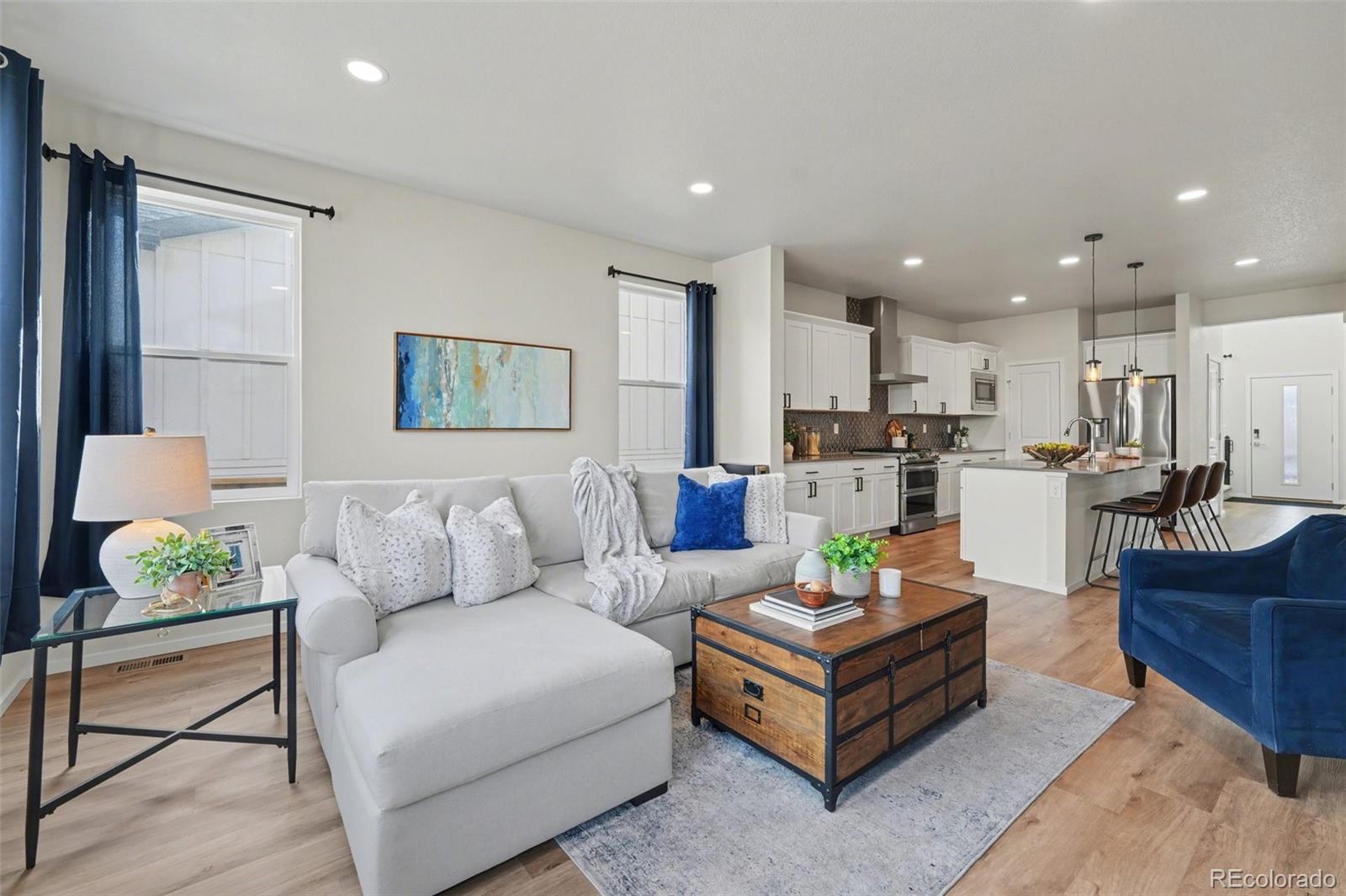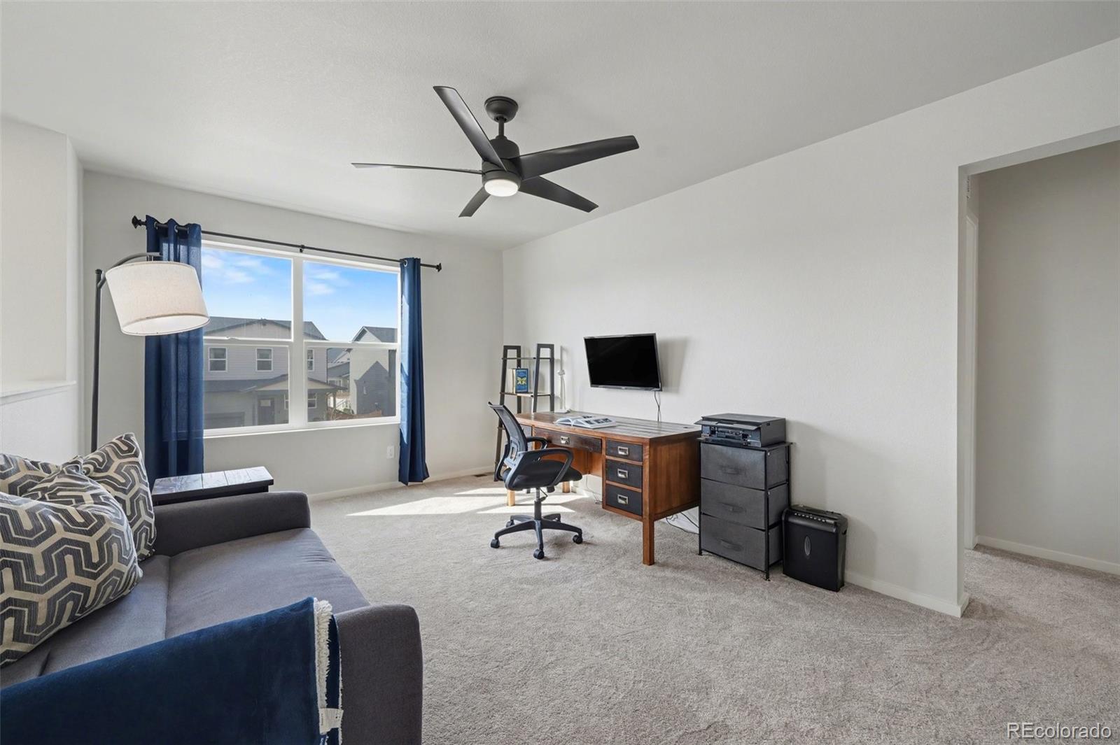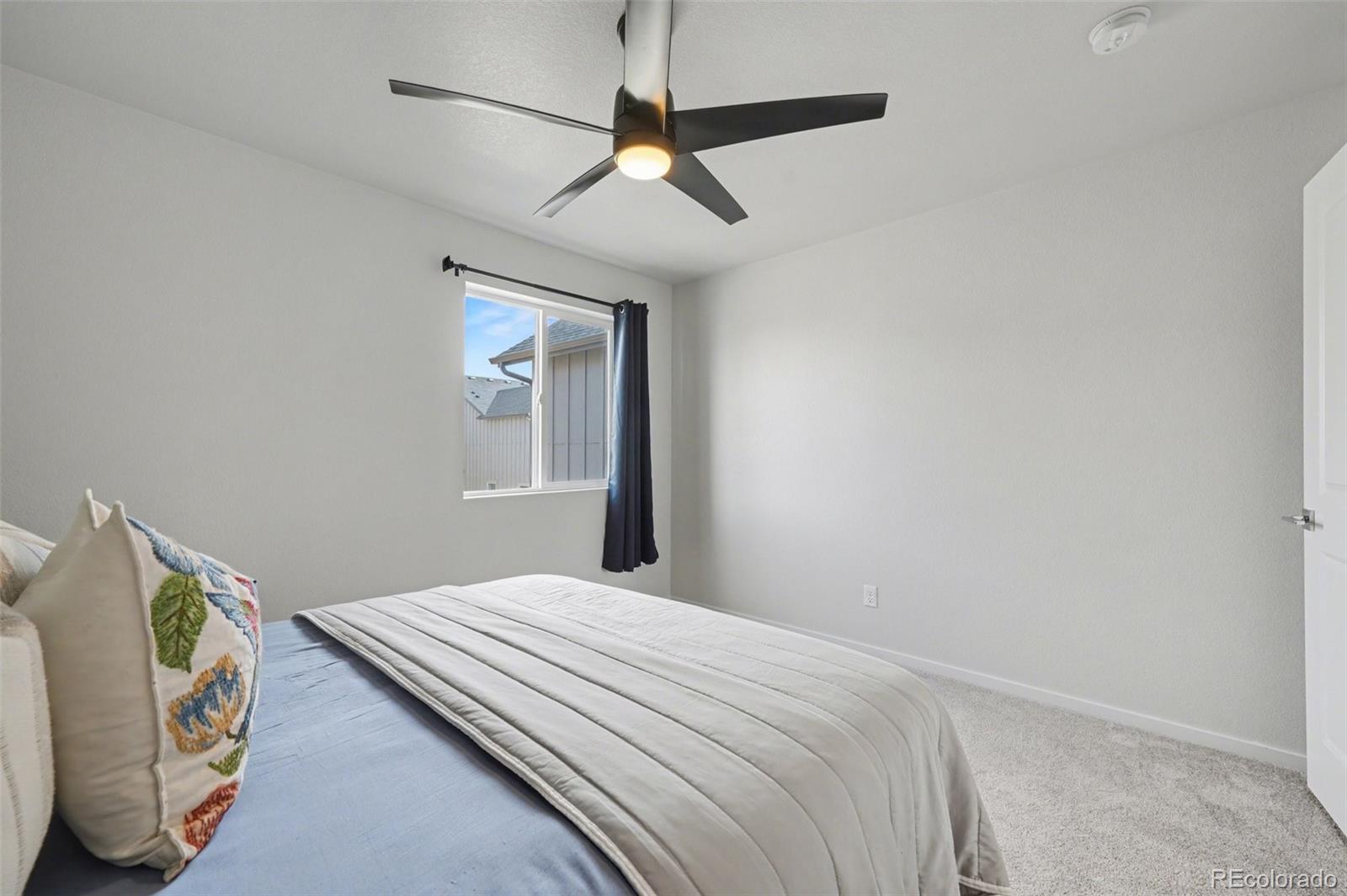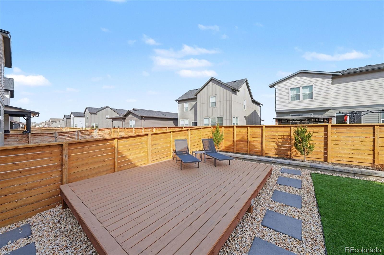 Open-concept 3-bedroom, 3-bath two-story home in the Mosaic neighborhood of Fort Collins with a professionally landscaped backyard and upgraded garage. The kitchen features quartz countertops, white soft-close cabinetry, stainless steel appliances, and an accent backsplash. The main level includes a flexible space suitable for an office or workspace. Upstairs offers a loft, laundry room with side-by-side washer and dryer, and three bedrooms. Additional updates include modern light fixtures, ceiling fans, and updated cabinet hardware. The unfinished basement includes rough-in plumbing for future expansion. The insulated two-car garage is drywalled and professionally finished with heating, air conditioning, EV-ready wiring, and a high-lift garage door. The backyard is professionally landscaped with low-maintenance turf, drip irrigation, and a sprinkler system, along with a concrete patio, freestanding deck, and apple tree. Custom fencing surrounds the front porch. Located in the Mosaic neighborhood with access to community amenities including a pool, pickleball courts, parks, and trails, and convenient access to I-25, the Fort Collins-Loveland Airport area, and Old Town Fort Collins.