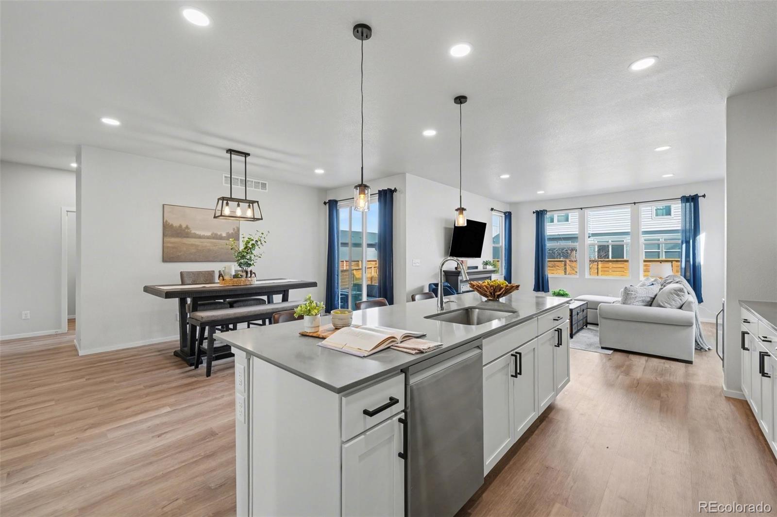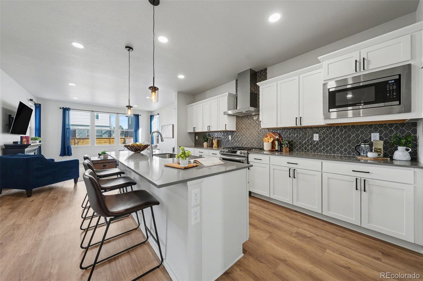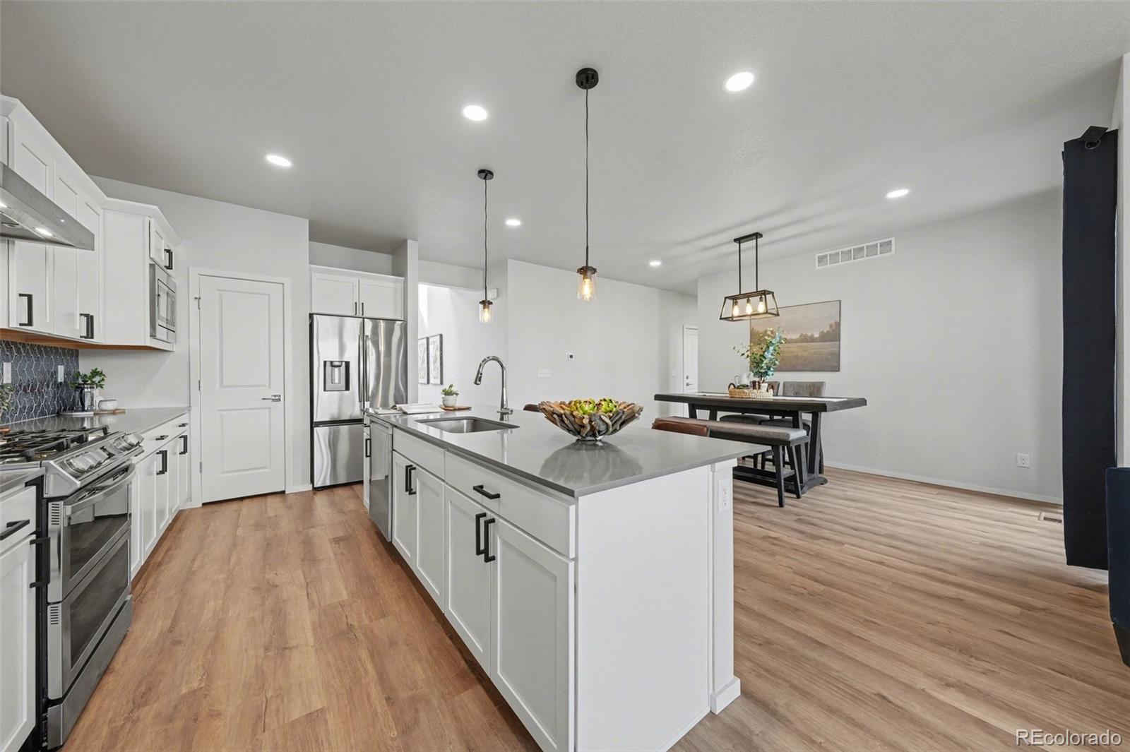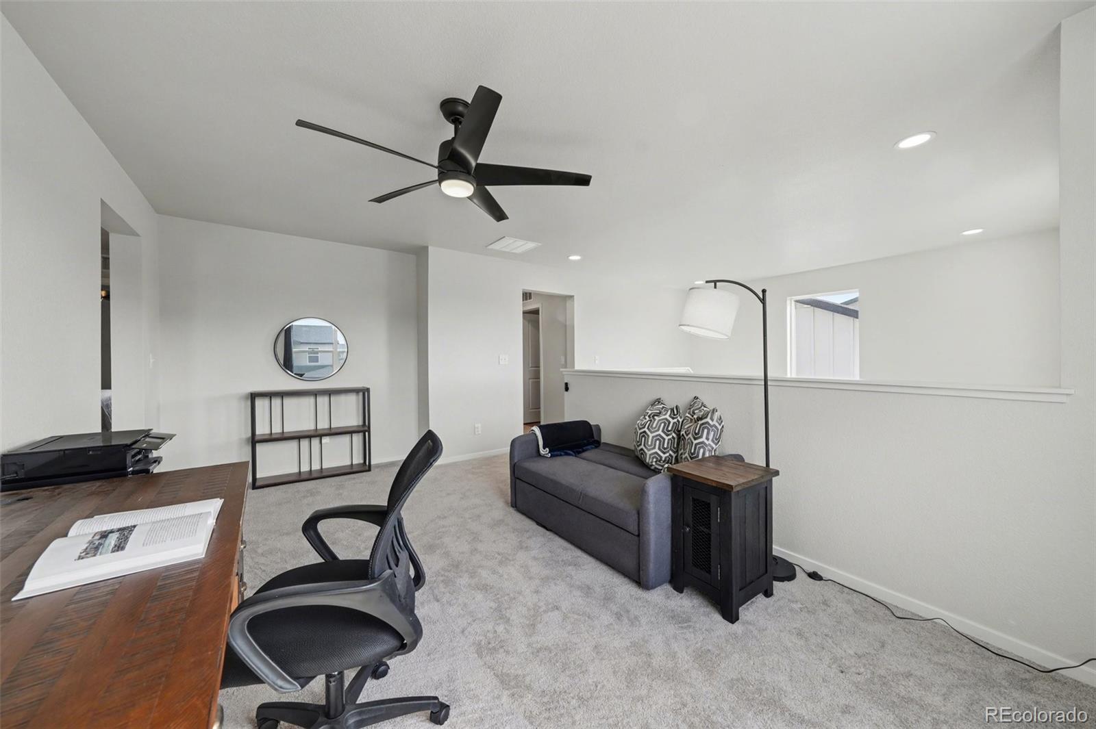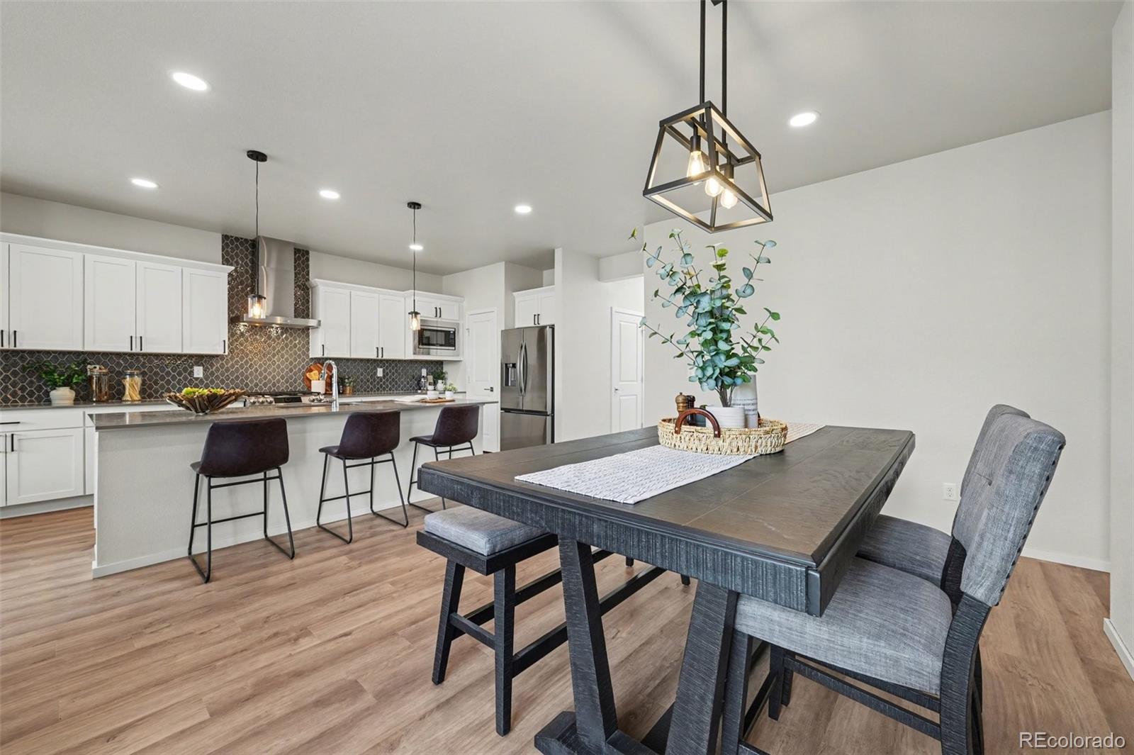 Open-concept 3-bedroom, 3-bath two-story home in the Mosaic neighborhood of Fort Collins with a professionally landscaped backyard and upgraded garage. The kitchen features quartz countertops, white soft-close cabinetry, stainless steel appliances, and an accent backsplash. The main level includes a flexible space suitable for an office or workspace. Upstairs offers a loft, laundry room with side-by-side washer and dryer, and three bedrooms. Additional updates include modern light fixtures, ceiling fans, and updated cabinet hardware. The unfinished basement includes rough-in plumbing for future expansion. The insulated two-car garage is drywalled and professionally finished with heating, air conditioning, EV-ready wiring, and a high-lift garage door. The backyard is professionally landscaped with low-maintenance turf, drip irrigation, and a sprinkler system, along with a concrete patio, freestanding deck, and apple tree. Custom fencing surrounds the front porch. Located in the Mosaic neighborhood with access to community amenities including a pool, pickleball courts, parks, and trails, and convenient access to I-25, the Fort Collins-Loveland Airport area, and Old Town Fort Collins.