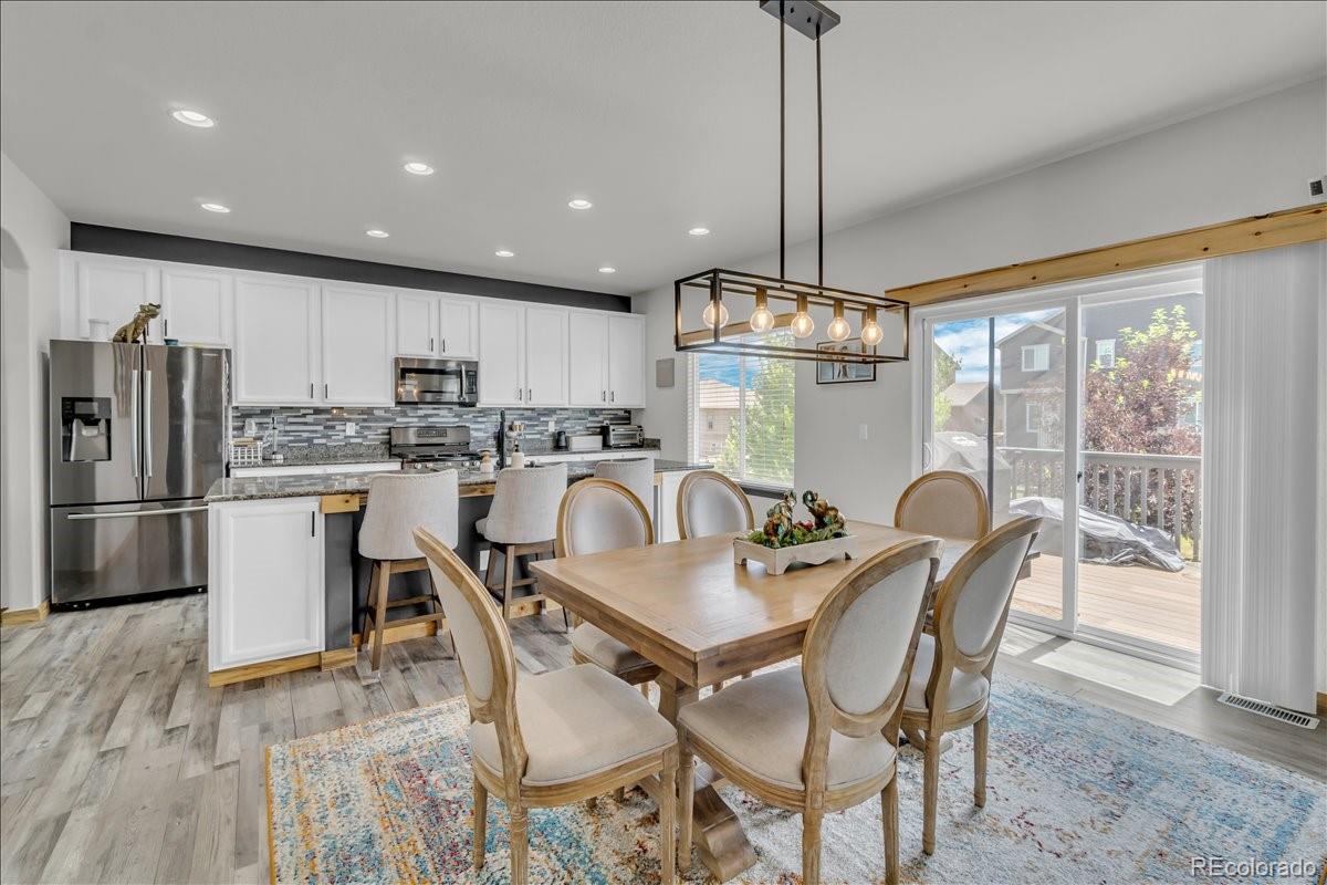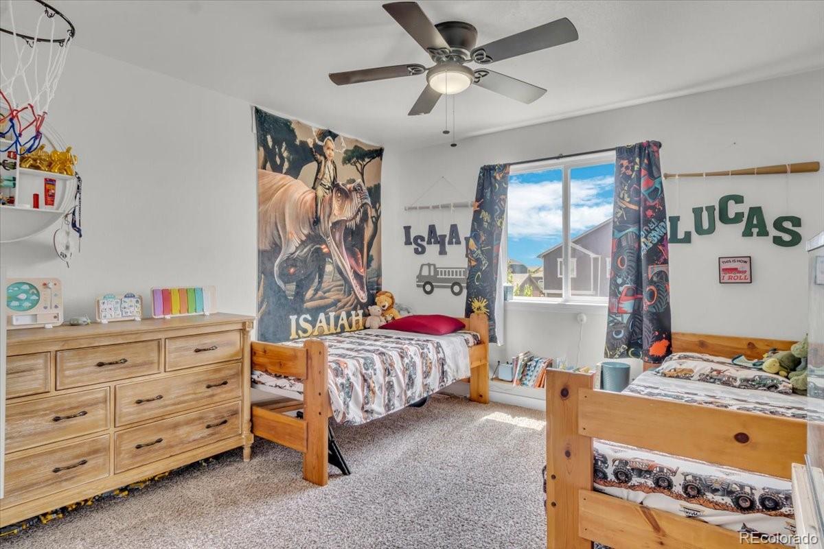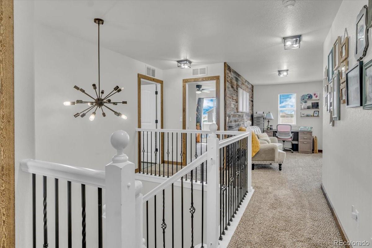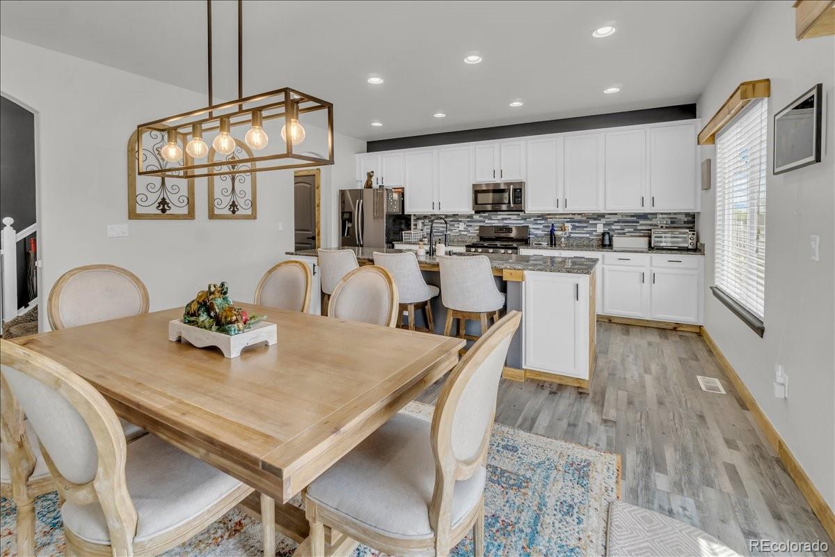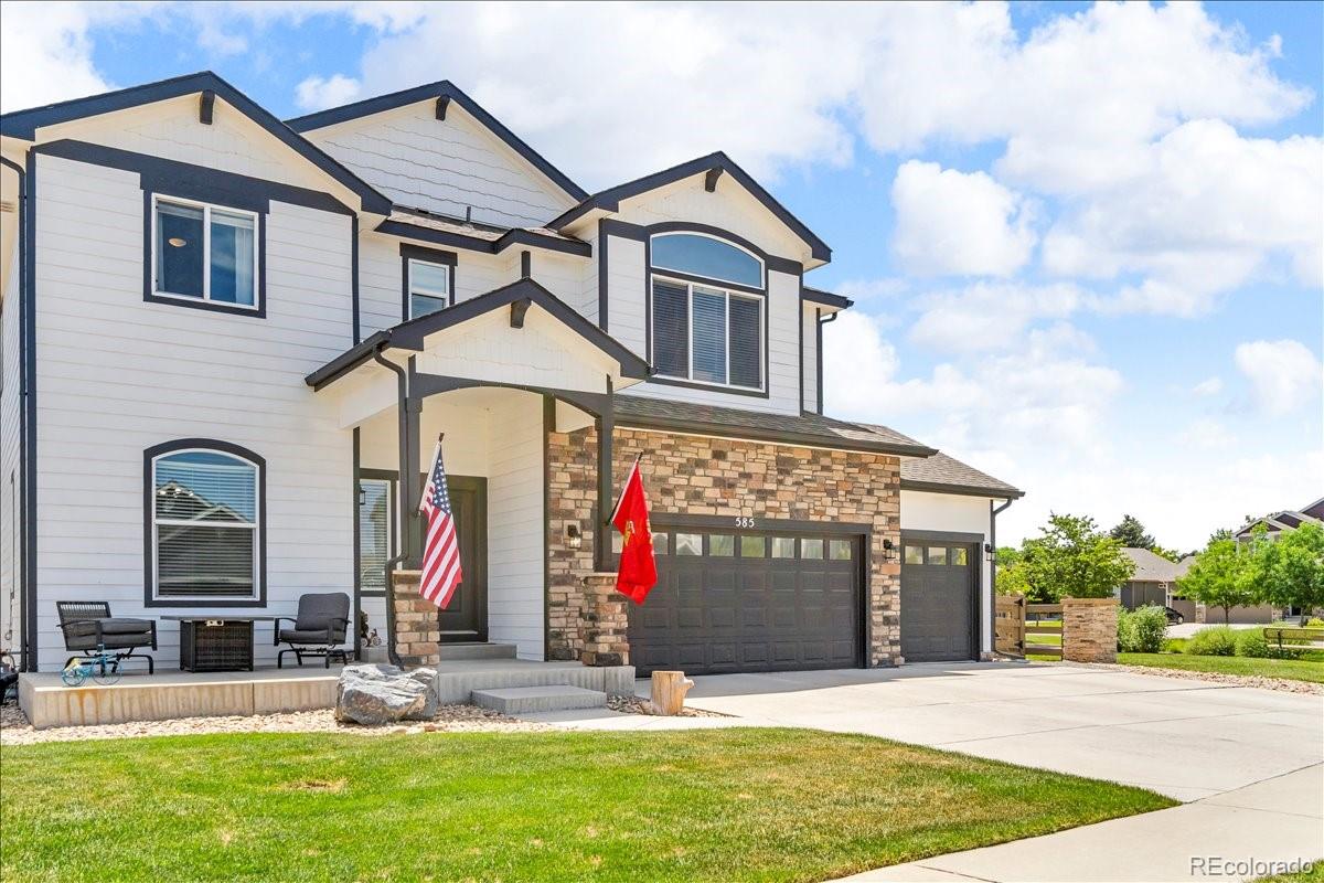 Welcome to 585 Canyonlands Street, a stunning 5-bedroom, 3.5-bathroom residence built in 2016 and exquisitely maintained in the desirable Heritage Ridge neighborhood. Offering 3,452 square feet of luxurious living space, this home seamlessly blends modern farmhouse charm with contemporary functionality . From the moment you arrive, the thoughtfully landscaped exterior and inviting front porch set the tone for a warm, welcoming experience. Inside, you'll discover vaulted ceilings, beautiful reclaimed barnwood accents, a spacious chef's kitchen with stainless appliances and a butler's pantry, and a cozy living room anchored by a gas fireplace. The upper level features a serene primary suite with cathedral ceilings, an elegant ensuite, and a loft area perfect for lounging or as a flexible workspace. Two additional bedrooms and a full bathroom complete the upper floor layout . The daylight basement adds tremendous value with two more bedrooms, a full bathroom, and a generous rec space ideal for media nights, a gym, or guests. Enjoy seamless indoor-outdoor living thanks to the brand-new $25K patio installed beneath the deck, ready for alfresco dining, morning coffee, or evening relaxation. You'll love the unbeatable location--this home backs directly to a park and is just a short stroll from the community pool, putting recreation right at your doorstep. Perfectly positioned in a vibrant community near trails, schools, downtown Berthoud, and major commuter routes, this modern farmhouse-style home offers style, comfort, and location--truly the best of Berthoud living. Don't miss this exceptional opportunity--schedule your private showing today and fall in love with 585 Canyonlands Street!