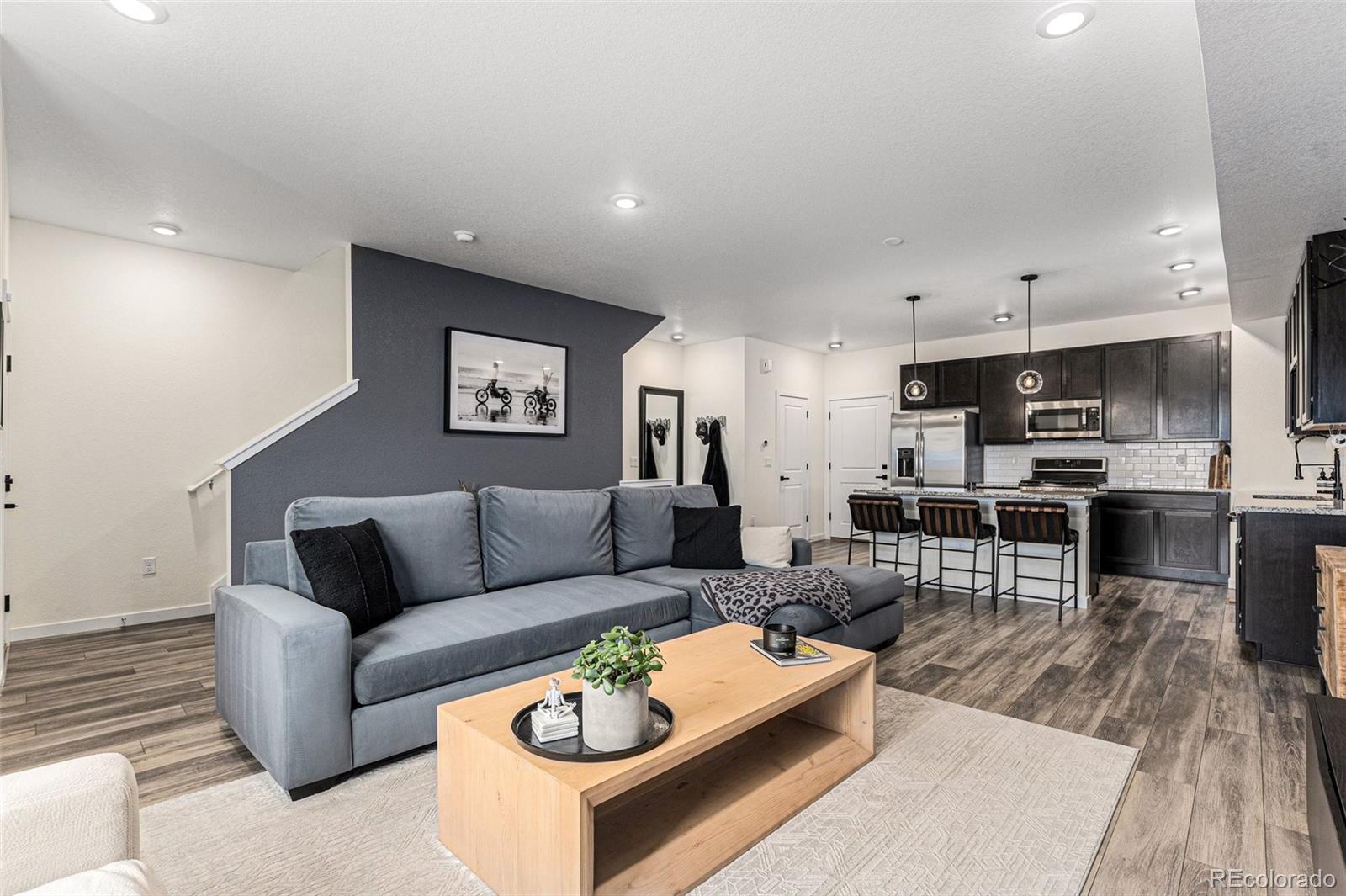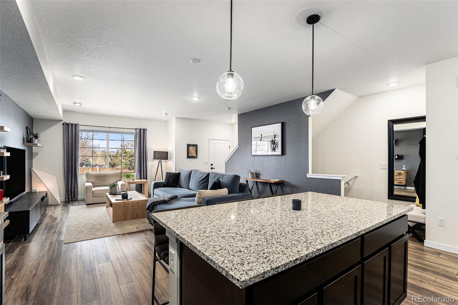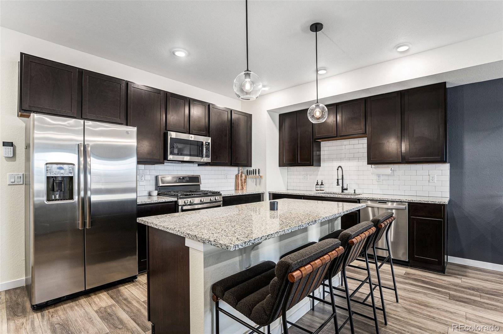 3-bedroom, 3-bath open-concept townhome in Thornton featuring numerous premium builder-selected upgrades throughout. The kitchen features maple cabinetry, granite countertops, soft-close drawers, a gas range, and an upgraded sink, with coordinating cabinetry and granite carried into the bathrooms. Floor-to-ceiling tile enhances each shower, including custom tile detail in the primary bath. Luxury vinyl plank flooring highlights the main living areas, complemented by upgraded lighting, door hardware, and plumbing fixtures. Additional features include a tankless water heater and smart home elements such as a Nest doorbell, Nest thermostat, SimpliSafe security system, and a WiFi-enabled smart lock. A 2-car attached garage and access to community amenities, including a fitness center, pool, and hot tub, add everyday convenience. Close to Lambertson Lakes Open Space, trails, and I-25 for easy access to recreation and commuting.